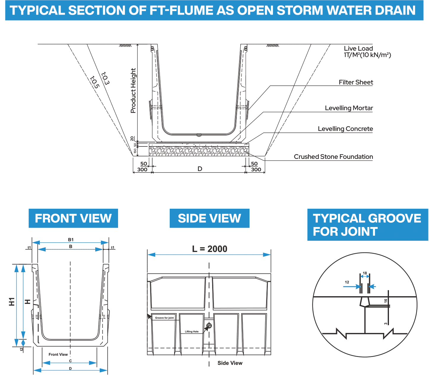 The FT Flume Precast U Drain is purpose-built for projects that demand precise, controlled water flow across longer channel runs. With a hydraulically optimised profile and dense RCC construction, it performs reliably in irrigation networks, agricultural canals, and roadside stormwater flumes — even in challenging terrain and high-rainfall conditions.